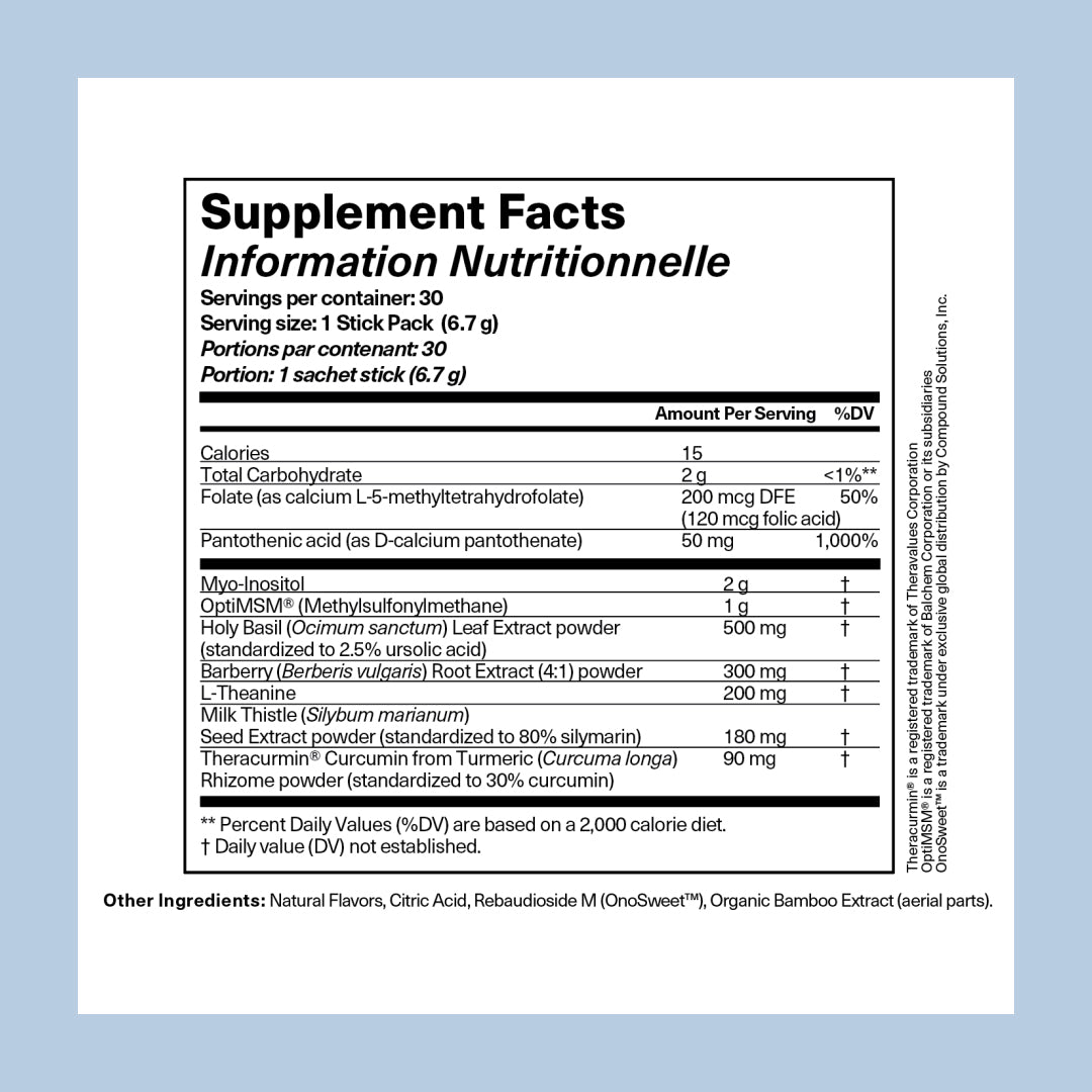 Doplněk stravy na každý den je navržen tak, aby řešil stres a hormonální nerovnováhu zánětlivého akné. Kombinuje protizánětlivé a na antioxidanty bohaté rostliny z ajurvédy: Tulsi / bazalku posvátnou (posiluje organismus proti stresu), kurkumu (blahodárně působí na čištění pokožky) a ostropestřec mariánský (podporuje játra), se složkami optimalizovanými pro pleť se sklonem k akné: L-Theanin (aminokyselina, která zlepšuje příznaky vyvolané stresem), MSM (působí protizánětlivě), Myo-Inositol (podporuje metabolismus) a kyselinu listovou (podporuje hormonální rovnováhu).